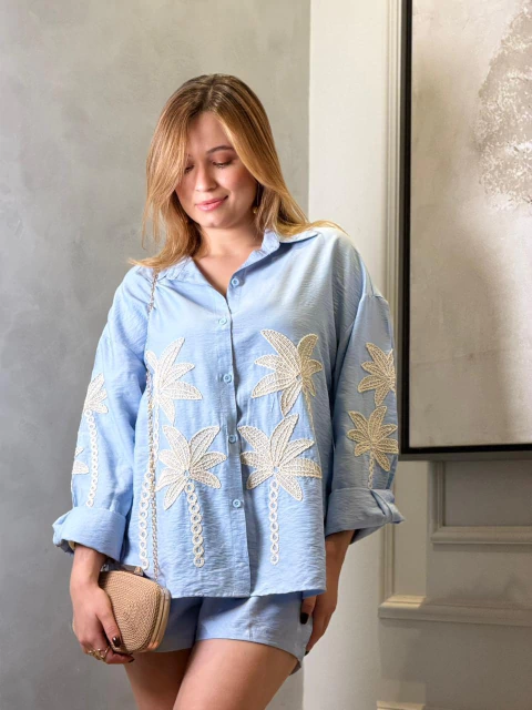 A camisa apresenta modelagem soltinha, botões frontais e bordados delicados em formato de folhagens, que trazem um toque artesanal e sofisticado ao look.