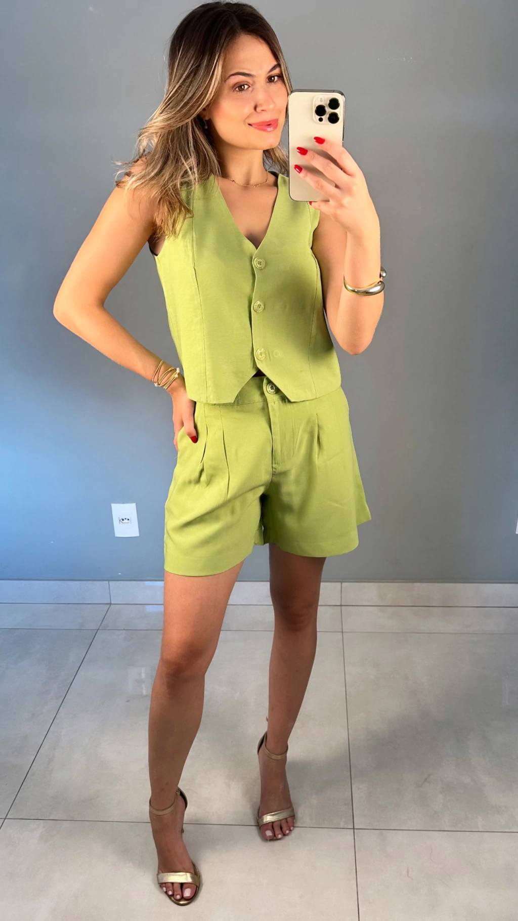 O colete apresenta fechamento por botões conferindo um ar refinado e contemporâneo. Já o short segue a linha clássica da alfaiataria, com cintura alta, barra reta e acabamentos bem definidos, garantindo conforto e estilo.